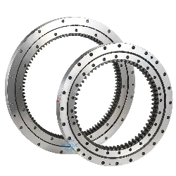 单排四点接触球式回转支承由两个座圈组成,结构紧凑、重量轻、钢球与圆弧滚道四点接触,能同时承受轴向力、径向力和倾翻力矩。回转式输送机、焊接操作机、中小型起重机和挖掘机等工程机械均可选用。