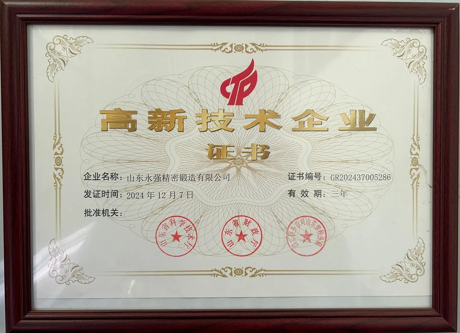 近日,山东永强精密锻造有限公司顺利通过由山东省科学技术厅、财政厅、国家税务总局山东省税务局联合组织的高新技术企业复审认定,正式获评“国家高新技术企业”。